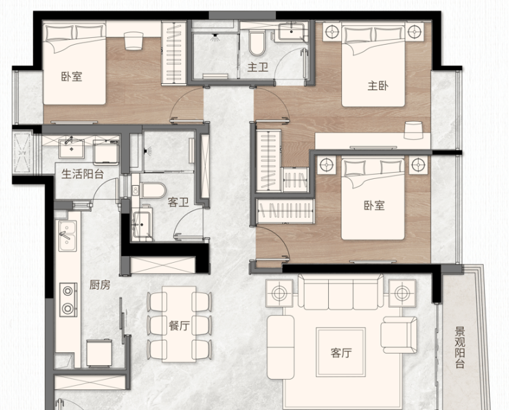 建面117平三房,这个户型阳台飘台都比较大,视野比较广,客卫三分离设计,主客分明。