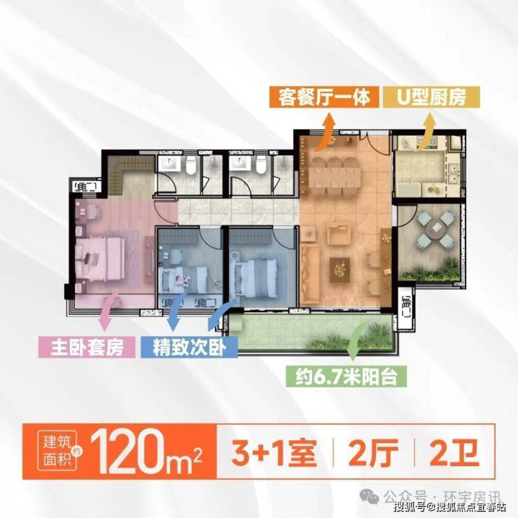 【7栋120㎡户型鉴赏】①专梯入户,高使用率; ②主卧大套间,享独立衣帽间; ③五开间朝南;④6.7米大阳台