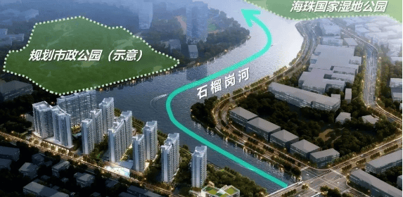 周边 3km 范围内有 125 个公园,距离最近的仅 475m,海珠湿地公园就在旁边,此外 3 公里范围内还有海珠湖公园、瀛洲生态园、广州国际生物岛