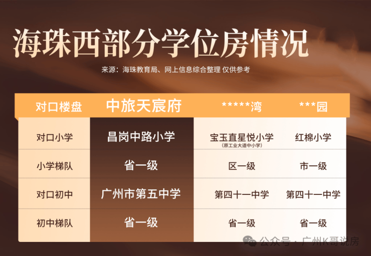 项目位于海珠区最强教育板块之一,根据海珠区教育局公布《2024年海珠区公办小学招生服务地段表》:中旅天宸府所属沙园街橡胶新村社区,约500米直距昌岗中路小学,符合就近入读条件。