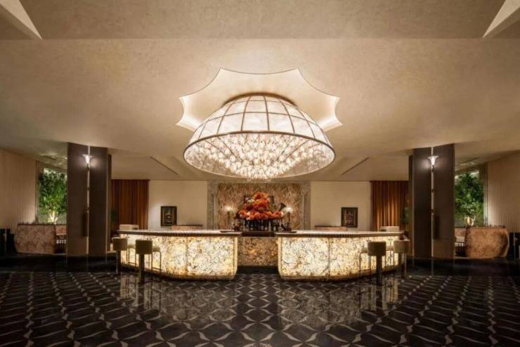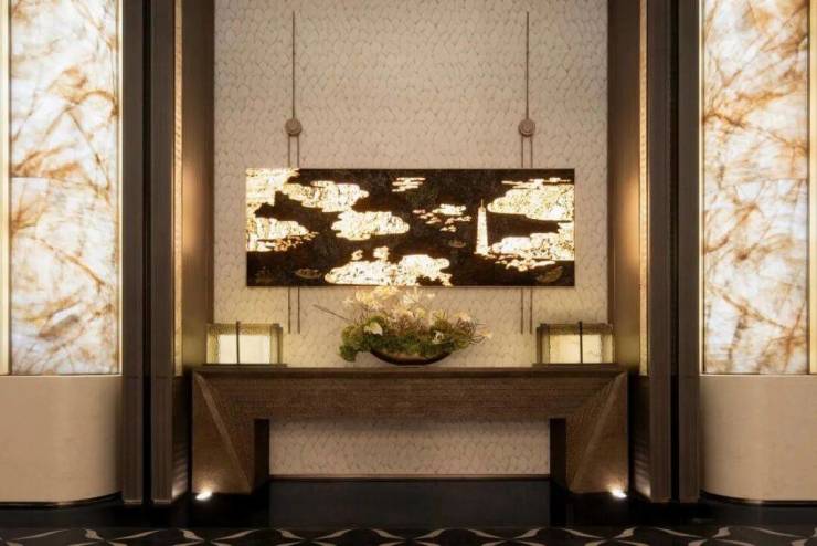 透过中空挂落,日光倾泻而入下方的“金石浮光”的艺术雕塑,阳光与金石肌理交织出细腻的纹理,低调奢华的氛围扑面而来。