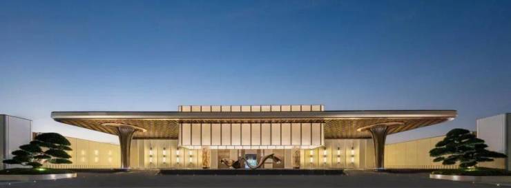两株的罗汉松阵列两侧,隐喻根基稳固、福泽绵长,更所谓“门庭有树,家宅生辉”。大门入口两侧各十三片取自克罗地亚的弧形贝金米黄大理石,以永恒的品质见证业主的辉煌。