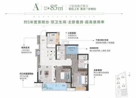 85㎡ 3房2厅2卫,南向3房带主套设计,生活更随心