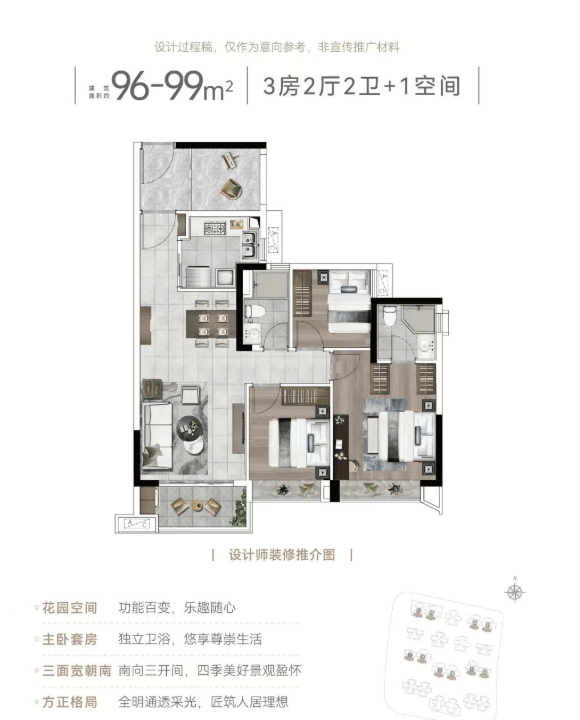 项目依马鞍山而建,推窗即见绿意,远眺山景如画。二期“畔山组团”更是占据社区最私密位置,外揽马鞍山自然山景,内拥中央绿轴园林,营造出闹中取静的山居生活意境。户型设计亦十分考究,主力产品三开间朝南,采光通风俱佳,使用率普遍超过90%,在同价位产品中极具竞争力。