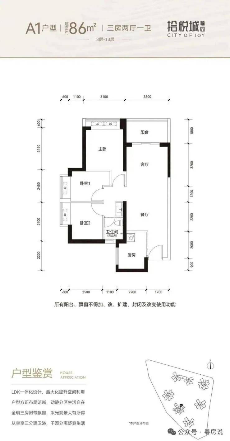 86平三房:设计的是竖厅格局,进门入户玄关,客厅3.3米开间,LDKB一体化设计,3个卧室分别做到了3.1米/2.9米/2.45米的宽度,U型厨房,卫生间三段式分离,得房率:76.92%(不含赠送),阳台1.8米宽度,东北朝向。