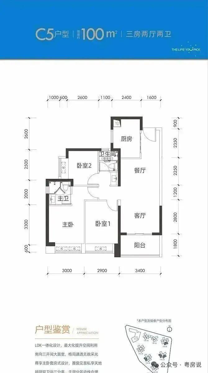 100平三房:设计的是竖厅格局,进门入户玄关,客厅3.4米开间,LDKB一体化设计,3个卧室分别做到了3米/2.9米/2.5米的宽度,U型厨房,公卫三段式分离,得房率:77.14%(不含赠送),阳台1.8米宽度,西南或东南朝向。