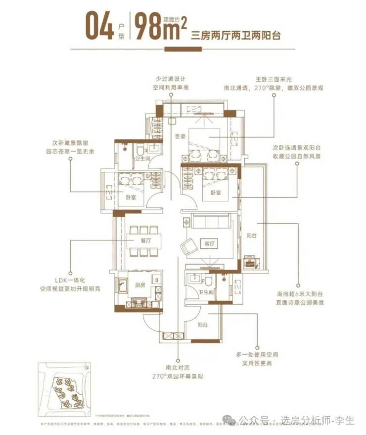 98㎡户型全新升级,主朝向朝南,让阳光洒满每一个角落。主卧配备 270° 无柱飘窗,视野开阔,美景尽收。次卧和阳台尺度大幅增加,提供更加舒适的居住体验,无论是休闲娱乐还是晾晒衣物都更加从容。