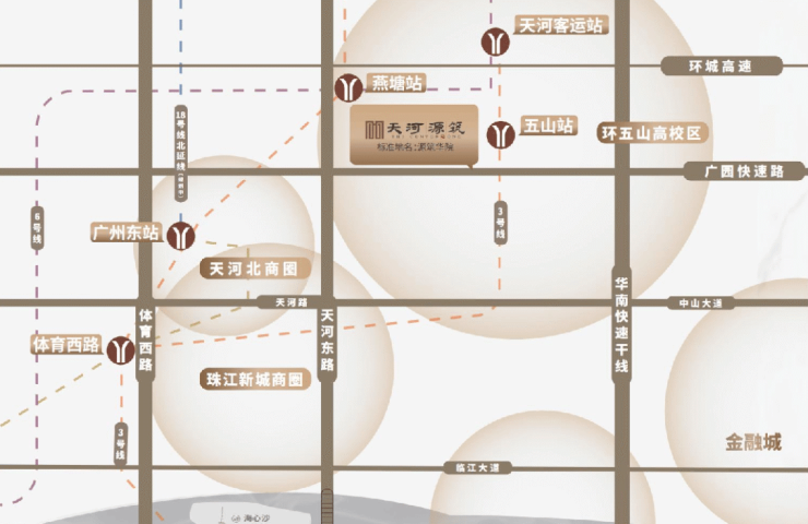 项目紧邻华南快速干线和广园东快速干线,交通便捷。周围聚集了众多知名企业总部,产业氛围浓厚。此外,项目周边拥有丰富的教育资源,包括华工、华农、暨大、华师四所著名高校,以及汇景实验学校等优质学府。