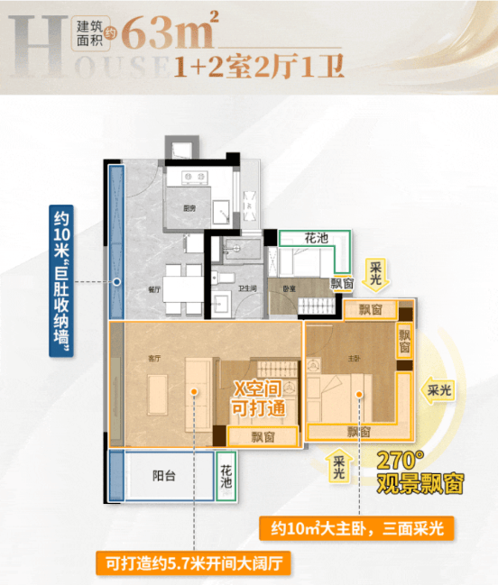 建面63㎡三房两厅一卫是片区内少见的小户型三房,三开间朝南设计带来9米采光面,LDKB一体化布局让餐客厅空间更通透,没有多余的过道浪费