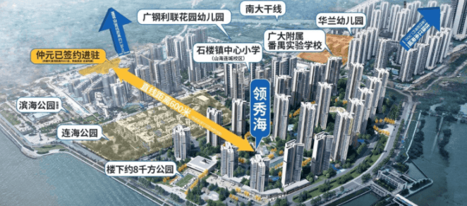 社区周边500米内还有华师大附属华兰幼儿园、山海连城公立幼儿园,888米可达广大附中番禺实验学校