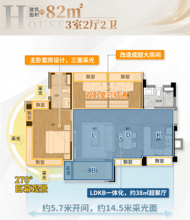 建面82㎡三房两厅两卫采用片区*的小户型横厅设计,5.7米横厅开间让空间感媲美百平户型,南北对流格局提升了通风效果