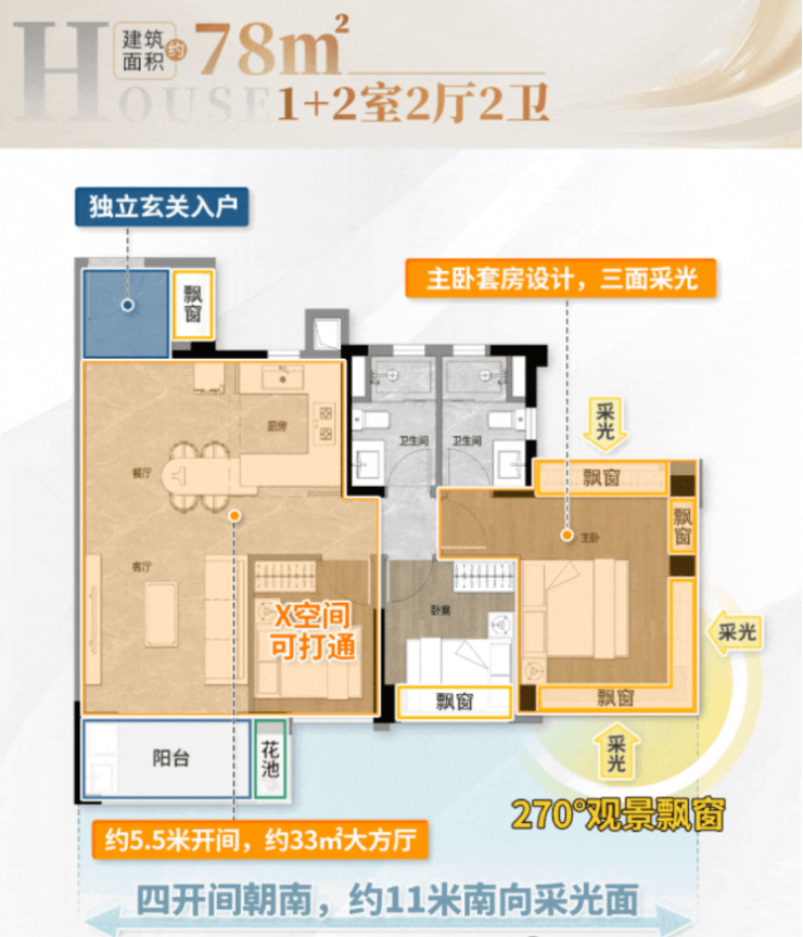 建面78㎡三房两厅两卫主打三口之家居住,四开间朝南的采光面超11米,双卫设计彻底解决了早晚洗漱高峰的问题