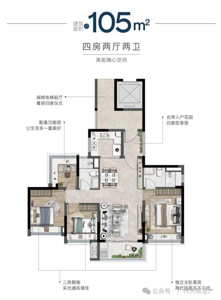 主推建面约104-168㎡全四房户型,两梯两户或两梯三户设计