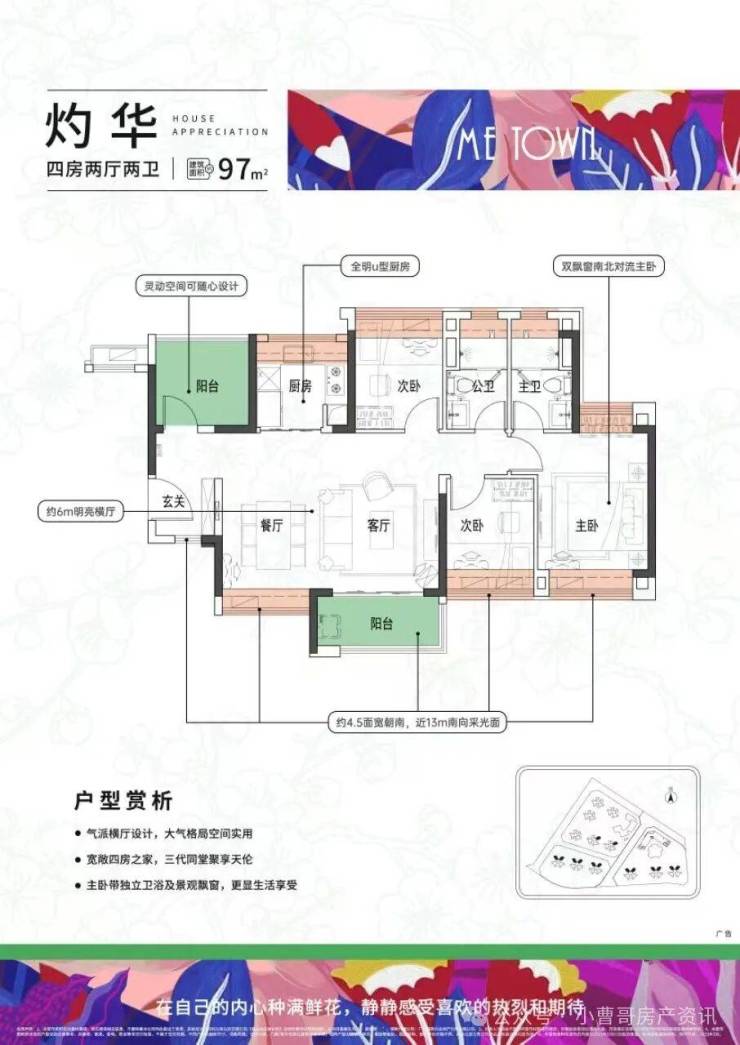 建面约97㎡四房两卫宽绰横厅高实用率💯