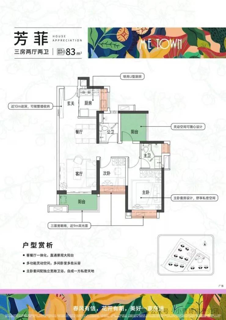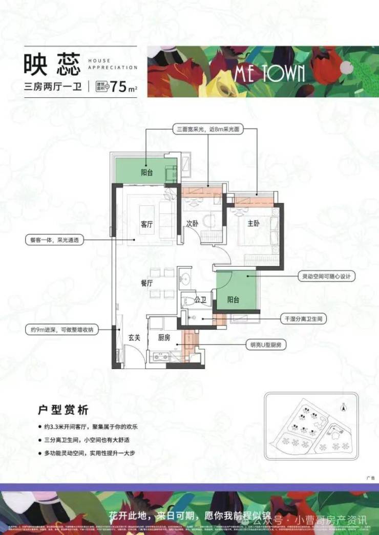 项目主打户型建面约75㎡~97㎡三四房户型,使用率非常高,75方可以做到2+1房2厅1卫的布局,非常适合刚需,总价105万这样,83㎡的户型则带是主套的设计,而且实现阳台、主卧、次卧三开间朝南,性价比同样很不错,加上九年制广外附,如果从南沙整体的房价来看,这边属于价格洼地,还有不错的九年一贯制公立名校