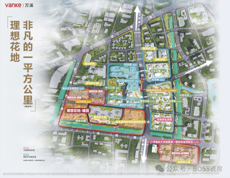 理想花地约18万㎡城市级购物中心、约7.5万方社区及街区商业、约2.5万方精品商业中心(规划中)