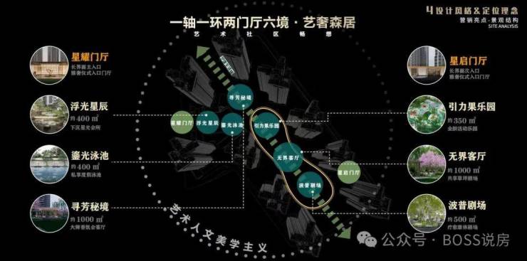 一轴:约 300 米艺境归家路,串联香氛迎宾、流水花园、中央草坪等节点,归家仪式感拉满。