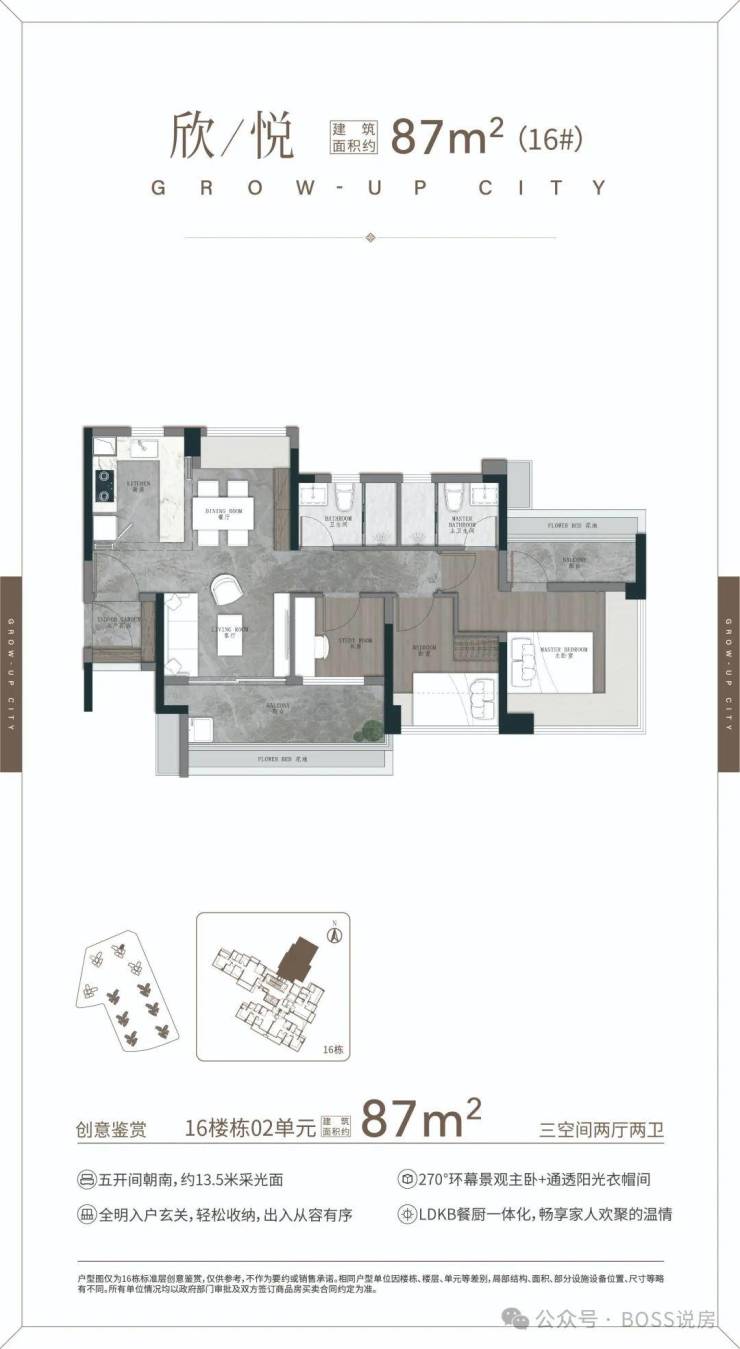 86㎡ 三房2厅2卫,南向四开间约 11.1m采光,主卧360°无立柱景观飘窗