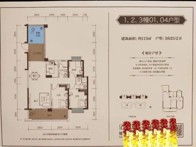 在售户型:80㎡2房2厅1卫;113㎡3+1房2厅2卫