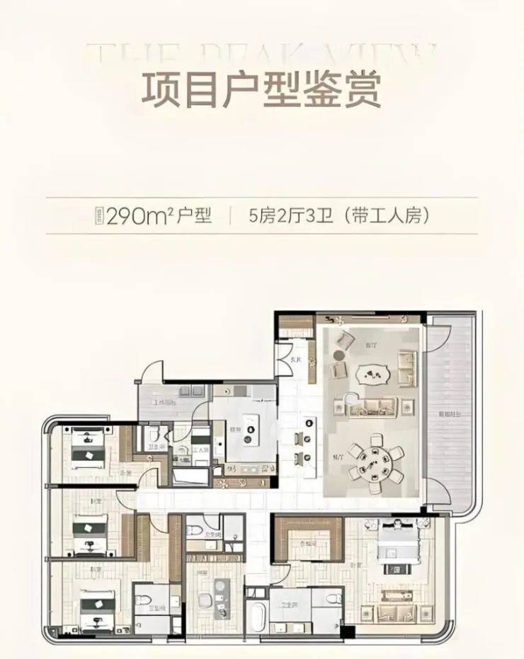 290㎡的五房两厅四卫大户型,配备独立书房和景观阳台,预留了充足的家庭活动空间。