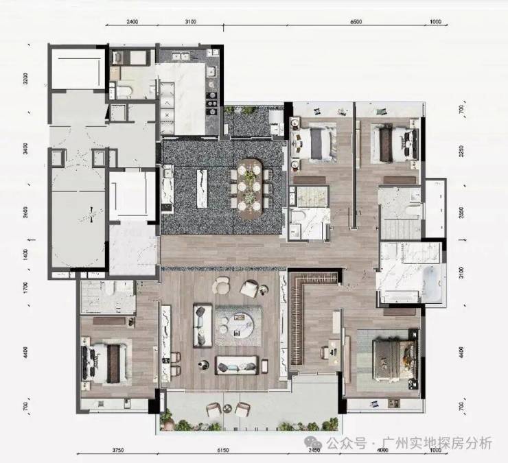 产品:项目共设置了6个户型面积,分别为198㎡四房、250㎡四房、289㎡四房、256㎡四房、317㎡四房、348㎡四房,这些四房的差别就是卫生间多一个,或者带工人房。