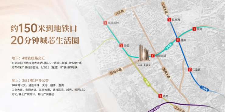 【距地铁仅150米·下楼即享公交站】 项目距离8号线宝岗大道地铁C出口仅150米,步行2分钟即达,约15分钟直达荔湾陈家祠(6站)、转2号线约15分钟直达海珠广场(4站),约20分钟到天河珠江新城(7站)。 下楼即享多达20条公交线路车站,迅达全城。 对于追求出行方便的老广们,家门口就能坐上地铁、公交。地铁同时还能转广佛线、地铁2号线,全家人的便捷交通,才是真正的便捷。