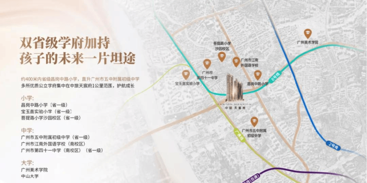 【仅500米·对口省级昌岗中路小学·可直升广州市五中】 项目位于海珠区最强教育板块,根据广州市海珠区教育局政府信息公开网站,《2022年海珠区公办小学招生服务地段表》中显示,项目所属沙园街橡胶新村社区,直接对口省一级昌岗中路小学。同时,《2022年广州市海珠区初中招生问答》中显示,昌岗中路小学直升广州市五中附属初级中学。(注:学区地段规划以及小升初直升信息以教育局最新公布信息为准)