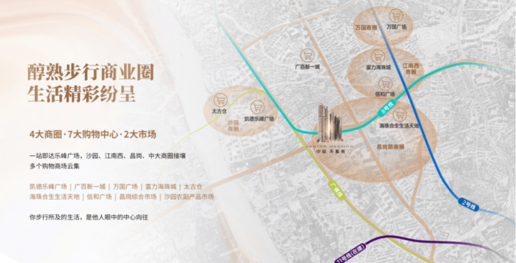 【最成熟配套汇聚·四大商圈围绕 】 雄踞海珠西部核心配套,与昌岗,江南西、乐峰广场、中大商圈相互接壤,老广最喜欢的聚集地。 拥有全广州最大的沙园市场,更有年轻人休闲娱乐必去的太古仓、广百新一城、富力海珠城、万国广场等打卡点云集,隔条马路便是吃饭/宵夜必去的宝业路,吃喝玩乐应有尽有。 500米步行南方医科大学珠江医院,广州医科大学附属第二医院、广州市红十字会医院等多家三甲医院保驾护航。