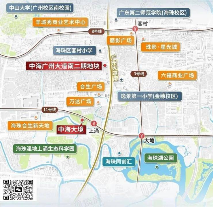 旁边现有华海九年一贯制学校,即华附海珠国际双语学校,项目西北面直线2公里就是中山大学。