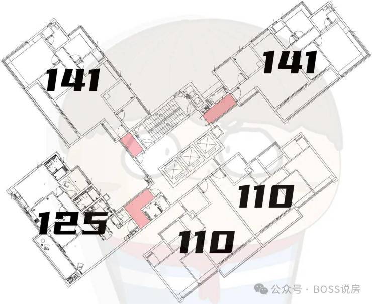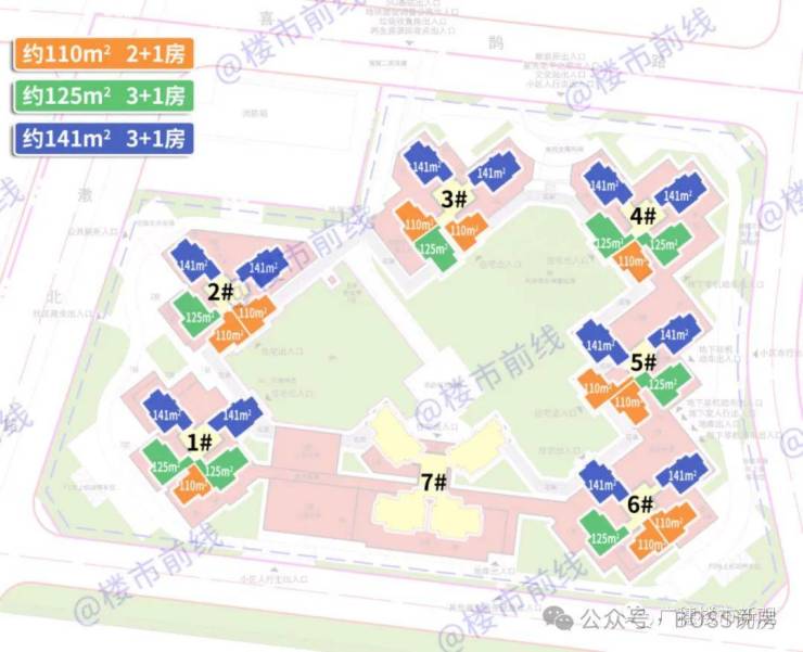 7号楼180㎡,三梯四户,1-6栋110-141㎡,三梯五户。
