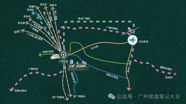以空铁融合、站城一体规划北站商务区,构筑城市发展的向芯力;依托T4航站楼及白云机场快速APM线,实现广州北枢纽+空铁联运+商务中芯三大能级联动,打造引领珠三角、辐射中国南部、面向世界的生活中芯场域。