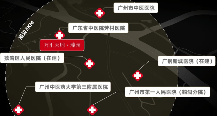 三公里内,优享 6 所甲级医院,广州医科大学附属第一医院花地湾院区(三甲)也正常营业了,也能给业主提供健康体检、医疗技术等专属服务,全天候为家人健康护航。