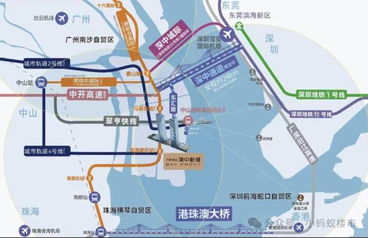 ⑤机场:未来乘坐地铁18号线,直达广州白云机场;楼下中山港新客运码头,一船即达香港国际机场、深圳机场以及澳门机场。