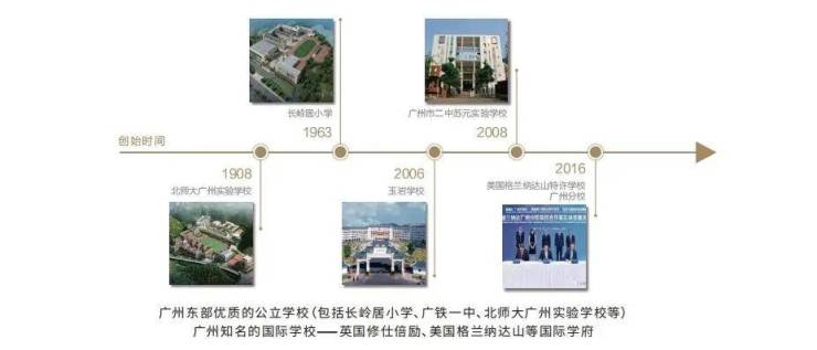 长岭居小学、北师大广州实验学校(小学部)提供基础教育服务,并且初中阶段可通过摇号方式进入三所名校之一学习。