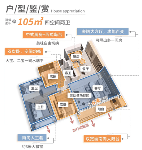 105㎡四房两厅两卫是当前主力在售户型,剩余约25套房源,1号楼以低楼层为主,2号楼涵盖中高楼层,低楼层总价530万起,中高楼层580万起。