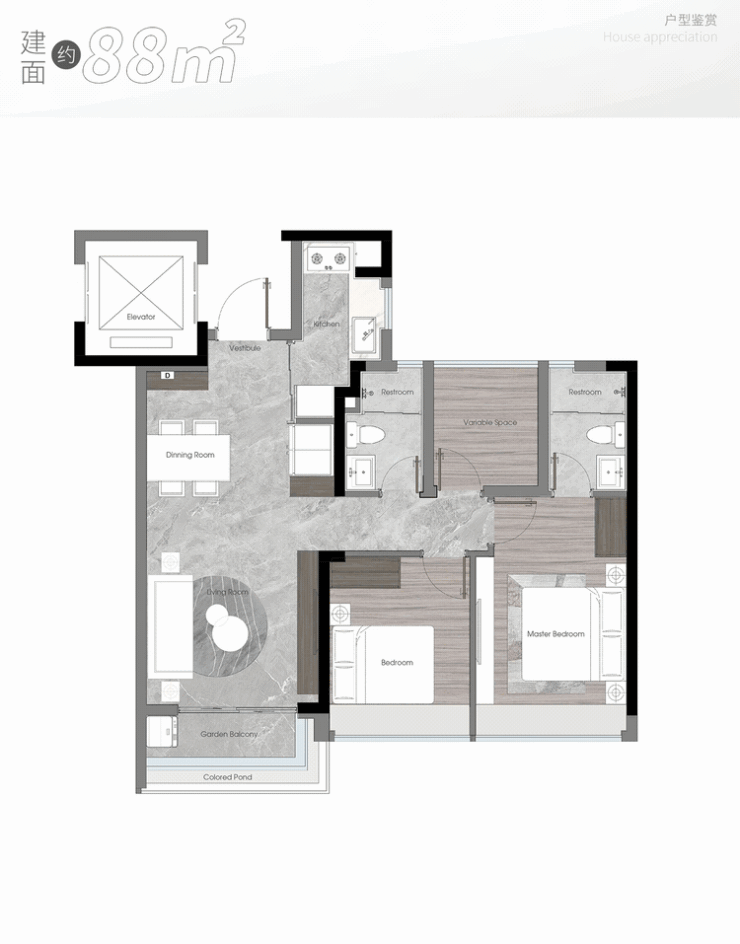 即便是建面约88㎡户型,南向面宽也高达约9.6米,开间进深比接近1:1的黄金比例,通透性和使用率达到Max级别。