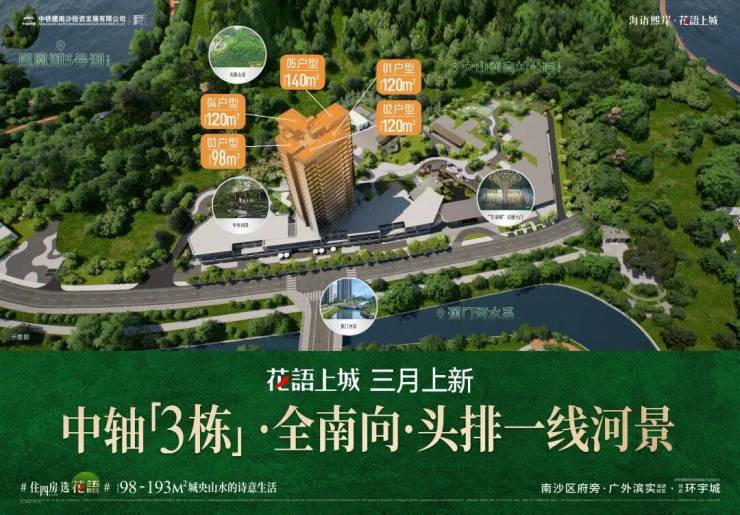 位置上:处在花语上城头排中心,是中轴之上的一线河景房,前后视野均好。