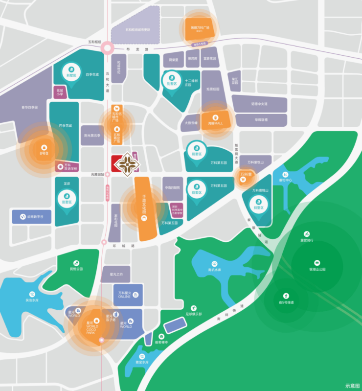 周边环境看,坂田南片区被五大别墅群环绕,拥有三大水库及银湖山环绕。