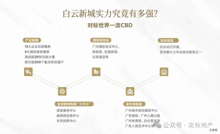 广州新一代CBD白云新城CBD,定位为国际交往中心、总部经济集聚区和云山西麓宜居新城,突破了传统CBD单一产业功能的局限,成为粤港澳大湾区唯一集空港经济、跨境贸易、科技创新、总部集聚于一体的综合性经济中枢。