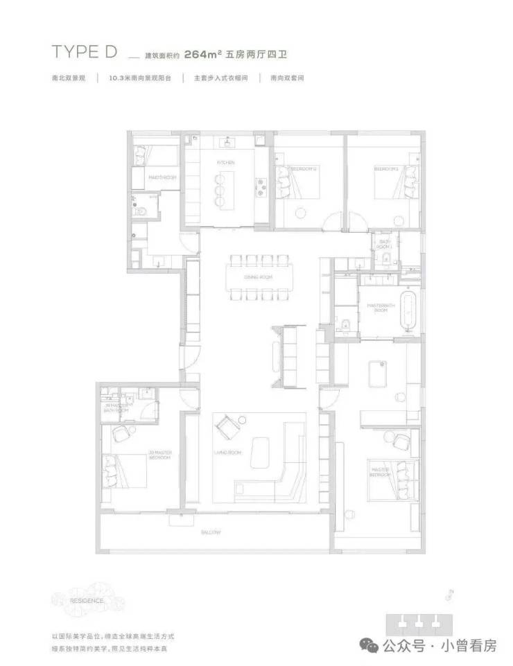 264为五房两厅四卫产品,更细腻的产品设计,超奢华四件套南向主卧,标准南向次主卧, 6.6米巨型方厅,纵向超长LDK一体化空间,专属家政保姆空间,超大容量收纳空间,令居住的尊贵从每处品质细节里流露而出,创造独一无二的奢享体验。