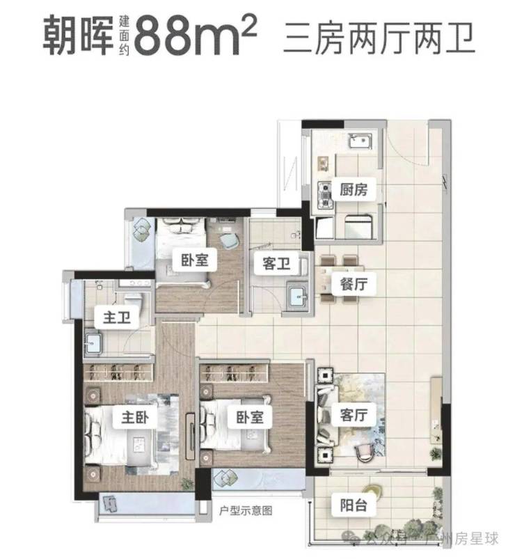 建面88方三房两卫,有南向有北向,9.1米面宽,每个卧室主卫都带飘窗,空间利用较好,L型厨房,北向房源,主卧次卧阳台都能望山景,南向三开间朝南,主卧次卧阳台都望小区园林,