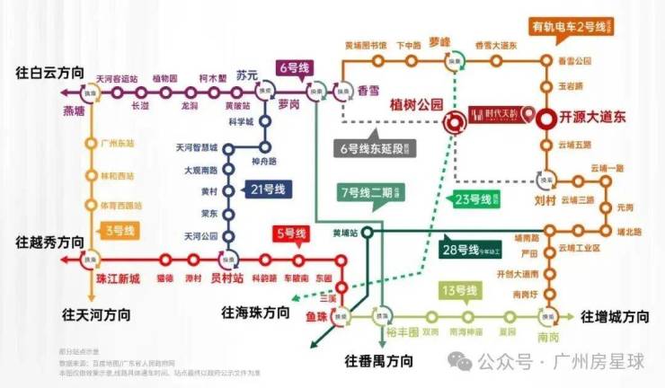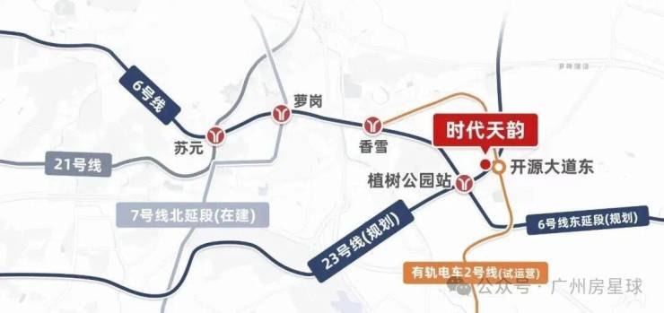 小区门口就是黄埔有轨电车2号线开源大道东站,天韵业主从家门口出发,5站就能抵达香雪,接驳6号线,无需环线可直达天河、海珠、越秀等地,此外规划中的6号线东延段和23号线,也会在附近的植树公园站交汇。