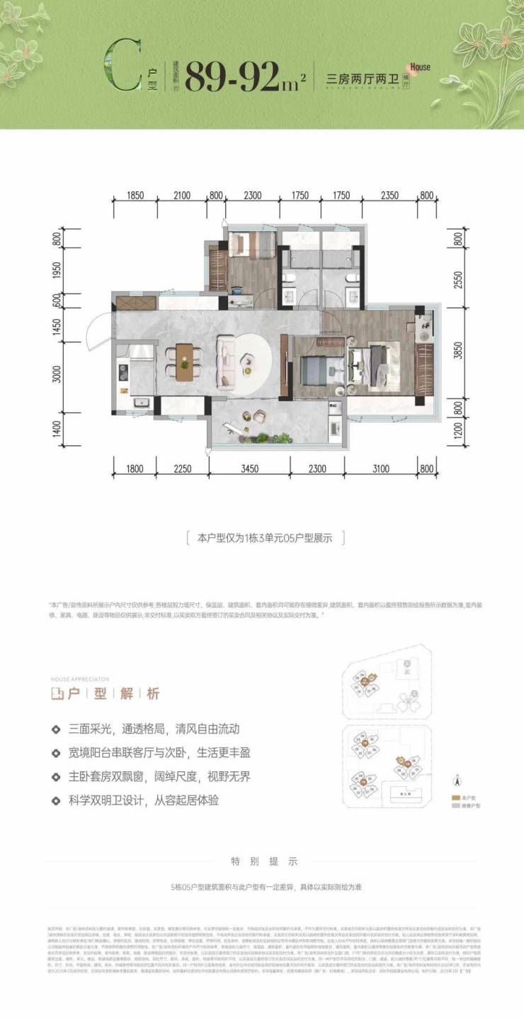 89-92㎡的3房2厅2卫,B户型,设计的是竖厅格局,客厅3.45米开间,LDKB一体化,S墙设计预留冰箱卡槽位,三开间朝南,动静分区,主卧270无边转角飘窗,3个卧室分别做到了主卧18.1㎡/次卧9.44㎡/次卧5.98㎡(包含墙体飘窗),客厅连接次卧出5.75米长的大阳台,U型厨房,公卫三段式分离,得房率约93-99%(包含赠送),西南或东南朝向。