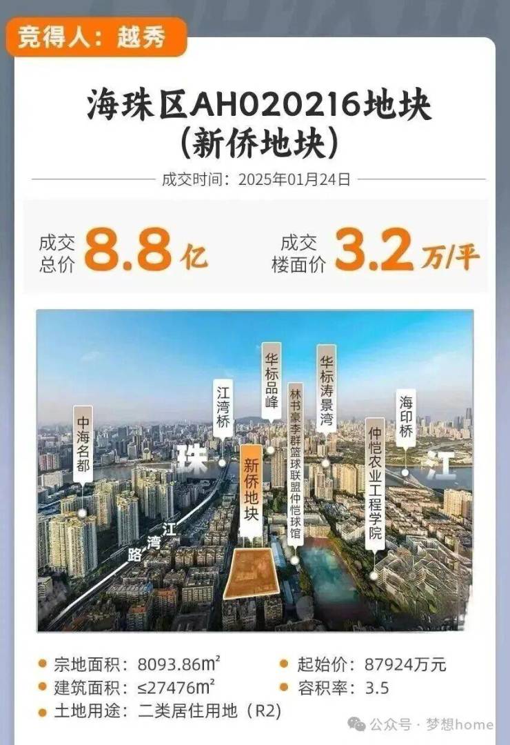 2025年1月24日,2025年广州首宗宅地---海珠滨江中AH020216地块,即江湾路以西地块,又称新侨地块,被越秀以底价近8.8亿的总价、3.2万/㎡的楼面价拿下。