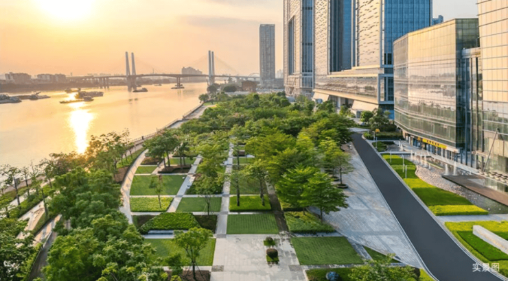 约10万m2“时代浪潮"滨江园林贯穿整个园区,回应珠江的碧波远影,让千年海丝文脉和珠江人文底蕴得以延续。