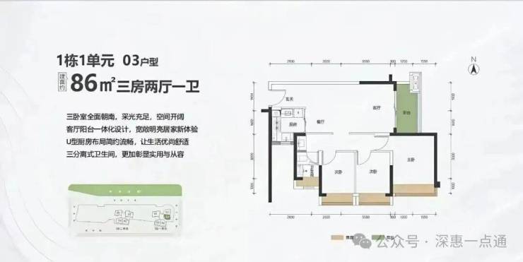 86㎡的3房2厅1卫,1栋1单元03户型,设计的是竖厅格局,客厅3.5米开间,LDKB一体化设计,进深9.95米,主卧全朝南,动静分区,U型厨房,卫生间三段式分离,阳台1.5米进深,东南朝向。