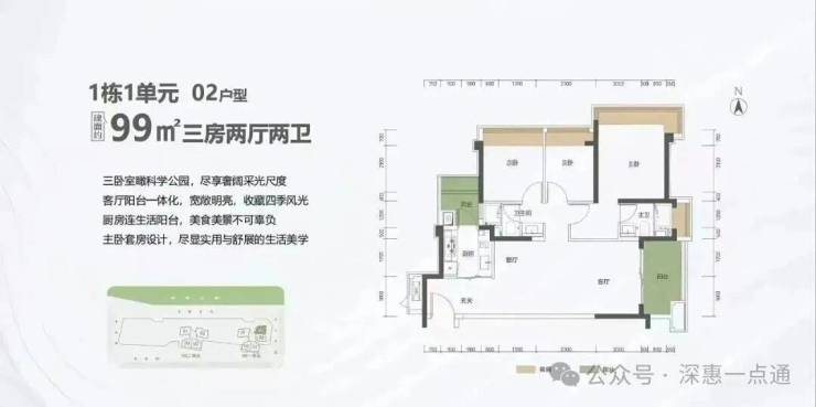 99㎡的3房2厅2卫,1栋1单元02户型,设计的是竖厅格局,客厅3.5米开间,LDKB一体化设计,进深11.31米,动静分区,三卧室朝东北向看科学公园,二字型厨房还带1个生活阳台,公卫三段式分离,阳台1.5米进深,东南朝向。