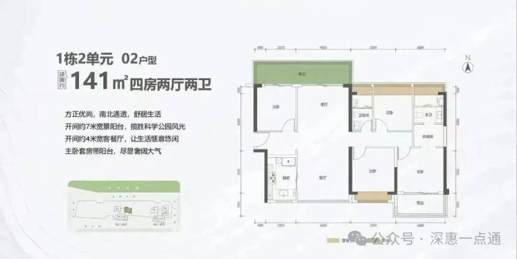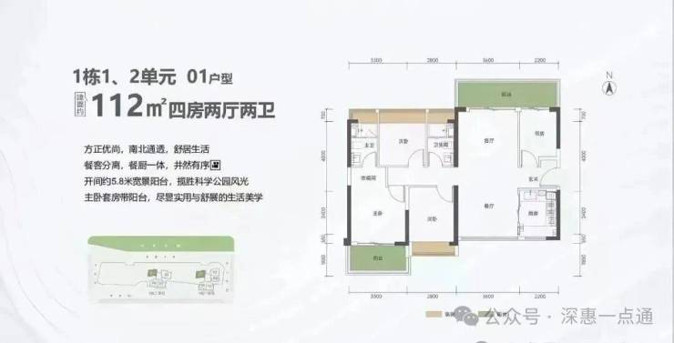112㎡的4房2厅2卫,1栋1/2单元01户型,设计的是竖厅南北通透格局,进门入户玄关,客厅3.6米开间,餐客分离,餐厨一体设计,四开间朝南,主卧套房带阳台,客厅连接次卧出5.8米长的巨幕大阳台,U型厨房,卫生间干湿分离,阳台主朝东北向看科学公园。