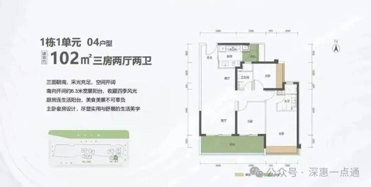 102㎡的3房2厅2卫,1栋1单元02户型,设计的是经典竖厅格局,进门入户玄关,客厅3.5米开间,LDKB一体化设计,三开间朝南,动静分区,客厅连接次卧出6.3米长的巨幕大阳台,二字型厨房还带1个生活阳台,卫生间干湿分离,西南朝向。