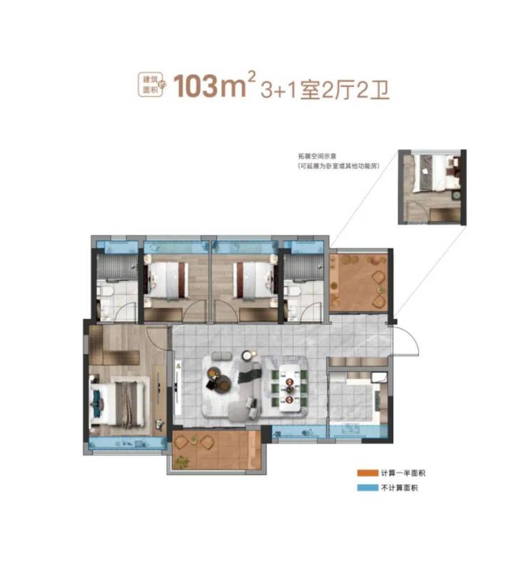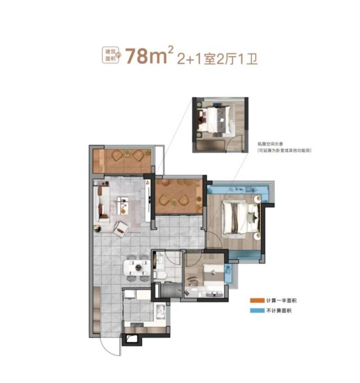 在售户型上有78㎡3房、93㎡3房、103㎡4房、产品设计还不错,加入了很多阳台、飘窗等拓展空间,整体实用率能达到90%以上。